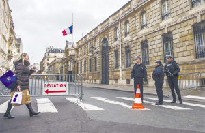 1月10日,在法国巴黎,通往总统府的道路仍保持封闭状态。《沙尔利周刊》袭击事件发生的当天下午,法国总理府网站宣布,将首都所在的整个巴黎大区的反恐预警方案的警戒级别提至最高。目前,巴黎大区仍维持该警戒级别。