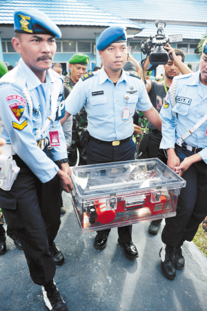 1月12日,在印尼庞卡兰布翁,印尼军警在转移打捞上的黑匣子。印度尼西亚搜救部门官员12日说,已打捞起失事亚航客机的黑匣子,该黑匣子为失事亚航客机上黑匣子之一的飞行数据记录器。失事亚航客机的另一个黑匣子——驾驶舱话音记录器已被定位,打捞作业正在进行中。