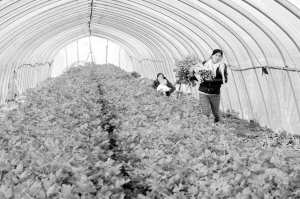 沈丘县付井镇郭岗行政村村民周战友通过该县推行的“惠民扶贫贴息小额担保贷款”政策,申请到了10万元的扶贫发展基金种植大棚蔬菜。经过一年的努力,周战友不仅还上本金和利息,还掘得了“第一桶金”,在脱贫路上迈出了坚实的一步。图为周战友女儿在蔬菜大棚里采摘芹菜。 (记者 韦伟 摄)