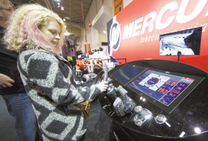 1月15日,观众在加拿大多伦多国际游艇展上操作一部操控台模型。