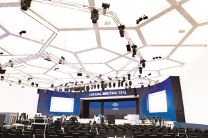 1月20日,工作人员在瑞士达沃斯经济论坛会议中心布置主会场。世界经济论坛年会于21日至24日在瑞士达沃斯举行。本届年会的主题是“全球新局势”。来自140多个国家和地区的2500余名政商学界及媒体代表将与会。