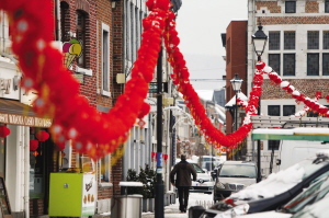 1月24日,比利时东部小城特镇街头挂满红灯笼。