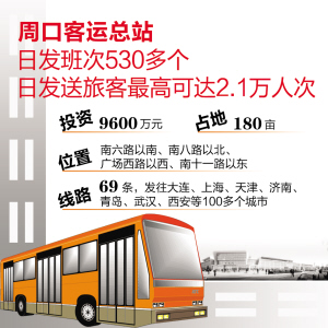 投入使用的周口客运总站位于南六路以南、南八路以北、广场西路以西、南十一路以东,计划总投资8241万元,实际投资9600万元,占地面积180亩,主要建设内容包括站务楼、办公楼及生产辅助用房3栋建筑单体,内设候车厅、售票厅、候车室、无障碍通道、汽车安全检测台等设施及站前广场、停车场等,可日发班次530多个,日发送旅客最高可达2.1万人次。