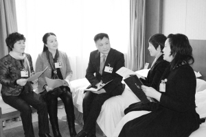 右图:参会的我市省人大代表在驻地抓紧时间学习会议材料,并相互交流、讨论,进一步整理完善议案和建议,为开好会议做准备。