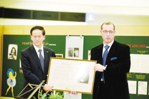 1月27日,在奥地利维也纳联合国总部,中国常驻维也纳联合国和其他国际组织代表成竞业(左)接受以色列常驻维也纳联合国和其他国际组织代表兹维·海费茨颁发的称赞中国外交官何凤山的纪念牌。