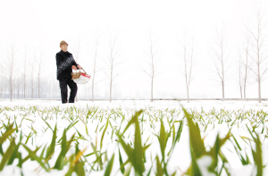 瑞雪过后施肥忙 1月29日,山东省临沂市郯城县郯城街道榆林六村农民梁作兴在雪后的麦田施肥。当日凌晨,山东省临沂市郯城县普降瑞雪,当地农民抓住雪后墒情好的有利时机给小麦施肥,促进小麦弱苗转壮。 新华社发