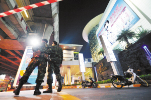 泰国曼谷发生两次小型爆炸 2月2日,在泰国曼谷,士兵在发生爆炸的暹逻百丽宫购物中心附近警戒。当日,泰国曼谷市中心暹逻百丽宫购物中心发生两次小型爆炸。经调查,爆炸是由两枚土制炸弹所引发的。新华社发