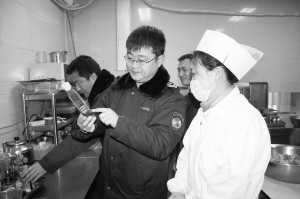 昨日,项城市食品药品监管局工作人员正在某宾馆后厨进行检查。