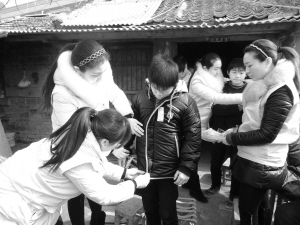 2月5日上午,西华县妇联携手暖心公益组织爱心志愿者到田口乡为贫困儿童家庭送去米、面、油等生活用品和慰问金,并给9个贫困孩子送去了新棉衣,让他们在寒冷的冬天感到了社会大家庭的温暖。图为志愿者正在给孩子试穿新衣服。(董小艳 摄)