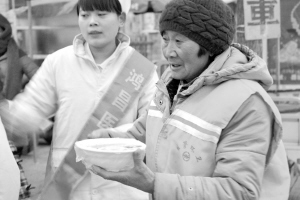 扶沟县委文明办、县志愿者协会积极开展自愿者活动,不断提升全县的文明程度。近日,志愿者们冒着严寒,组织了一场爱心早餐发放活动,为全县300多名环卫工人送去了热腾腾的早餐。图为环卫工人品尝爱心八宝粥。