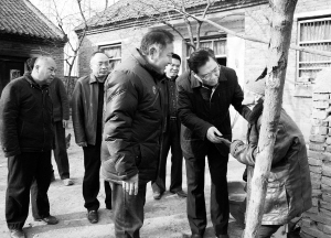 昨日,周口报业传媒集团党委书记李柏森(右二)一行,来到淮阳县冯塘乡贾庄行政村看望困难家庭和道德模范,为他们送去了慰问金和米、面、油等春节所需物资,把党的温暖和周口报人的一片心意送给了他们。 (记者 沈湛 摄)