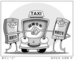 握手言“合” 快的打车与滴滴打车2月14日联合发布声明称实现战略合并,新公司实行联合CEO制度,业务依旧各自独立。 新华社发