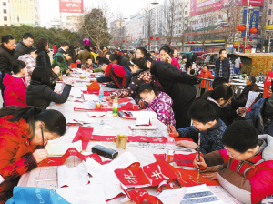 ② 新春佳节即将来临,三川大地处处洋溢着喜庆的氛围。市区五一广场,一群爱好书法的小朋友正在为市民义务写春联。(记者 侯俊豫 摄)
