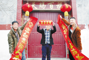 ④ 近日,扶沟县韭园镇湾赵行政村家家户户张灯结彩喜迎新年,盼望羊年五谷丰登。图为该村农民赵晨洁与家人一起展示新买的春联。