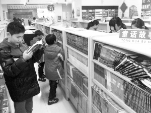 昨日,在市新华书店多个图书展区前,许多小读者正在埋头看书。春节期间,不少市民选择到书店看书买书,在享受文化的同时,也给自己“充电”,让喜庆的节日平添了几分书卷气。 (记者 侯俊豫 摄)