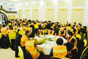 本报讯 (记者 徐启峰 通讯员 刘巍 文/图) 2月17日,农历腊月二十九上午,爱心人士韩平为川汇区环卫工人送去棉大衣,并邀请环卫工人共进午餐(如图)。