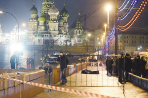 这是2月28日在俄罗斯莫斯科拍摄的涅姆佐夫遭枪击身亡现场。
