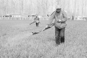 昨日,在项城市光武办事处的麦田内,农田托管服务队人员正在进行化除和病虫害防治。当前正值麦田管理的关键时期,项城市各镇(办)积极引导农民成立了农田托管服务队,吸纳有农技、有农机的农民入队,为周边农民提供农业服务,解决了外出务工农民的后顾之忧。 (张永久 摄)