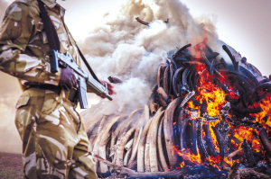 肯尼亚集中焚毁15吨走私象牙 3月3日,在肯尼亚内罗毕国家公园,一名肯尼亚野生动物保护局人员在焚毁走私象牙现场警戒。在2015年“世界野生动植物日”到来之际,肯尼亚总统乌胡鲁·肯雅塔当日在内罗毕国家公园点火焚毁了15吨走私象牙,并称国际社会在抵制野生动植物走私方面已达成共识,肯尼亚继续加强合作,减少非法象牙交易。