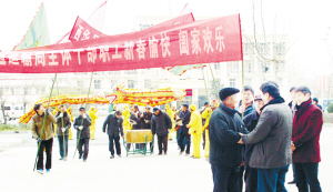 3月4日上午,柴城村舞龙队和几名村民敲锣打鼓,为县交通运输局送锦旗,以此感谢该局对他们村的帮扶。去年,逍遥镇柴城村在县交通运输局大力帮扶下,通过开展“美丽乡村”建设,使该村变得越来越美,越来越富。 (记者 张猛 通讯员 高磊 摄)