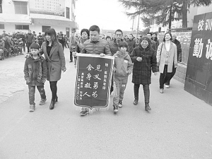 本报讯 (记者 朱红 文/图)3月7日本报以《姜振英:冰河救起双胞胎》为题报道了沈丘县县直高中教师姜振英冰河勇救落水双胞胎的英勇事迹。昨日上午,沈丘县县直高中锣鼓喧天、格外热闹。在锣鼓声中,得救孩子和亲属一起将一面写有“见义勇为 舍身救人”的锦旗送到姜振英手中。