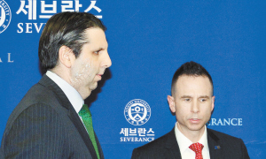 3月10日,在韩国首尔,美国驻韩国大使马克·利珀特(左)在出院前出席记者会。当地时间5日上午,利珀特在出席首尔世宗文化会馆举行的活动时,被一名韩国男子用刀划伤,袭击嫌疑人被当场抓住。