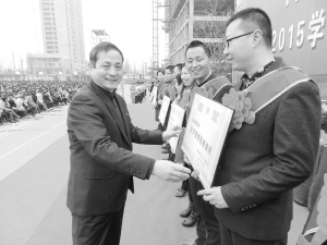3月8日上午,淮阳一高万余名师生在学校操场隆重举行新学期表彰大会。大会回顾了2014~2015学年第一学期的各项工作,对感动校园学生、优秀班主任、优秀员工、优质课教师等24个项目近500人次进行了表彰。淮阳县有关领导及淮阳一高全体师生参加了本次表彰大会。图为王业生校长为获奖人员颁发奖状。(豆纪锋 摄)