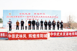本报讯 (记者 侯俊豫 通讯员 常远 文/图)3月6日至8日,由省体育局、省文明办、省农业厅主办的“全民健身、幸福中原”2015年河南省第十一届中原武术大舞台武术展示活动(淮阳会场)在陈楚古街东方神话游乐园举行。