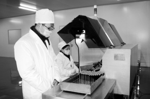 3月16日,项城市六合堂药业公司车间内工人在现代化的流水线上生产,一派繁忙景象。该市通过一系列措施吸引多家知名药企在项城实施战略重组,使项城医药业重新焕发了活力,形成了企业盈利、政府增收、工人就业的三方共赢格局,打造了全新的“医药城”。 (张永久 摄)