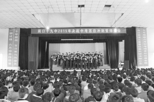 ▲3月16日下午,在距2015年中考百日之际,市第十九中学在学校大礼堂举行中考百日誓师大会,激发毕业班学生的学习激情,营造备战中考的浓厚学习氛围,让学生在备考的过程中体验拼搏的快乐与幸福。(杨培诚 刘枢衡 摄)