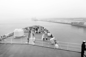 3月19日,长白山舰靠泊湛江某军港,舰员在甲板上列队。当日,历经7个多月、11万余海里航程的连续征战,中国海军第十八批护航编队胜利返航,靠泊湛江某军港码头。