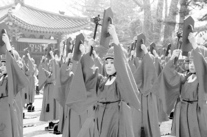 3月22日,在韩国首尔,成均馆大学学生在“释奠祭”中表演“武舞”。当日,位于韩国首尔的成均馆在大成殿前举办了春季祭孔大典,又称“释奠祭”。新华社记者 彭茜 摄