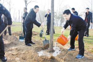 3月12日,皇甫立新等在植树点植树。当日,沈丘县四个班子领导来到县城东环路绿化带植树点,与当地群众一起挥锹铲土,参加义务植树活动。(记者 韦伟 通讯员 艾长青)