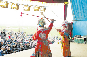 ①3月27日,商水县豫剧团演员在化河乡宁楼村表演豫剧《燕王扫北》,周围十里八村的群众也闻讯赶来分享文化大餐。农闲时节,该县文艺团体及文艺骨干积极开展“送戏下乡”活动,丰富农村文化生活。 (刘飞 摄)