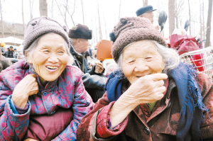 ② 3月26日,家住太康县芝麻洼乡西丁华村83岁的胡广兰和东李庄79岁的胡玉兰姐妹俩相约来到王大堂村观看太康县道情剧团的演出。演出的剧目是《白玉楼》,姐妹俩看着开心地笑了。 (记者 刘俊涛 摄)