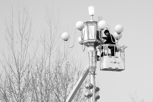 昨日,淮阳县城环城路上一名工人正在更换路灯。近年来,该县以“四城联创”(省级文明城、卫生城、园林城、中国旅游强县)为主抓手,以绿化、亮化、美化为重点,加快基础设施建设,完善城市功能,城市建设取得了良好效果。