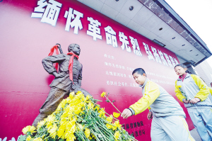 3月31日,几名学生正在向东北抗联小英雄何畏的雕像敬献菊花。清明节即将到来,长春市中小学生纷纷向烈士雕像敬献鲜花,缅怀革命先烈。