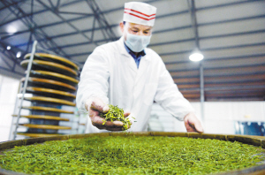 3月30日,湾里区大客天下茶叶生产基地的工人在对新采的鲜叶摊青。2014年,湾里区已建设形成茶叶基地8000亩,茶叶产量191.5吨,产值达1.5亿元,多个品种、品牌茶叶销往全国各地。(新华社发)