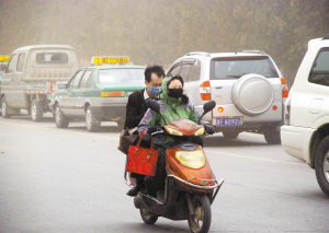 3月31日,甘肃省敦煌市街头,两名路人在沙尘天气中行驶。当日,甘肃省敦煌市出现强沙尘暴天气,当地交通出行、农业生产受到不同程度影响。