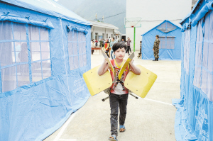 3月31日,在南加镇新柳村,一名儿童将课桌搬运进刚搭建好的帐篷学校内。当日是贵州剑河地震第二日,当地政府和群众正积极开展灾后重建,最大限度挽回地震造成的损失。(新华社发)