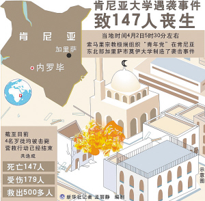 索马里宗教极端组织“青年党”2日血洗肯尼亚东北部加里萨市莫伊大学校区,导致147人死亡、179人受伤。这是2011年肯尼亚派兵进入索马里清缴极端分子以来该国遭受的最严重恐怖袭击。