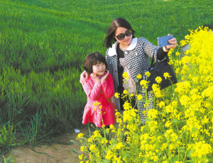 春日,田野里油菜花、桃花、梨花相继开放,吸引无数市民领着孩子走进田野、踏春赏花。图为扶沟县市民带领孩子踏青游玩。 (黄金峰 摄)