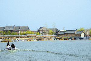 游客在碧水蓝天、烟波浩渺的龙湖里观赏美景。 (王映 摄)