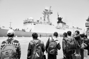 在亚丁湾、索马里海域的中国海军护航舰艇编队,接到上级命令后,迅速驶向也门紧急停靠。刘永选说,军舰从申请到靠岸一般要一个月时间,而这次我们只用了4天。