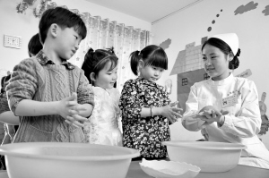 4月7日,医务人员在为河北成安县七色光幼儿园的小朋友讲解正确的洗手方式。当日是世界卫生日,河北省成安县人民医院组织医务人员来到辖区幼儿园,为小朋友们讲解如何正确洗手、刷牙等卫生知识,让他们认识到讲卫生的重要性,养成良好的卫生习惯。新华社发