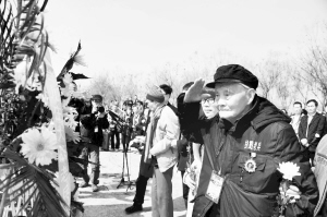 山东枣庄举行台儿庄大战77周年纪念活动 4月8日,101岁的台儿庄大战战士邵经斗在台儿庄无名烈士墓前敬献花篮并敬礼。当日是台儿庄大战胜利77周年。台儿庄大战的参战老兵、参战将士后人及社会各界人士来到山东枣庄台儿庄遗址缅怀先烈。新华社记者 郭绪雷 摄