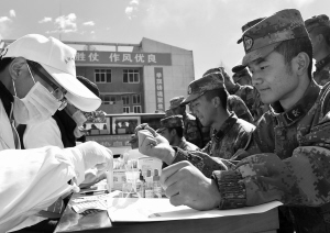 4月8日,西藏自治区血液中心工作人员在为成都军区驻西藏拉萨某部官兵验血。 当日,成都军区驻西藏拉萨某部队500多名官兵为西藏自治区血液中心及拉萨市区各级医疗机构进行无偿献血。 (均为新华社发)