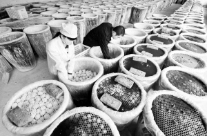 4月8日,在河北霸州一家传统松花蛋制作企业,工人将挑选好的生鸭蛋入缸。 河北省霸州市的胜芳松花蛋是河北省特产。多年来,霸州松花蛋不但供应国内市场,而且远销日本和南亚等国家和地区。
