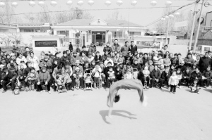4月8日,在官桥镇前莱村,滕州市北官庄剧团演员为当地群众表演武术。 当日,山东省滕州市“2015年全市送戏下乡文化惠民工程”在羊庄镇西石湾村启动。