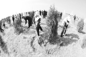 河北张家口:植绿黄羊滩 4月9日,宣化县县直机关干部职工在黄羊滩国营林场进行义务植树。当日,河北省张家口市宣化县的1200余名县直机关干部职工来到黄羊滩国营林场参加义务植树活动。近年来,为适应京津冀协同发展和京张联合申办冬奥会的要求,张家口市不断加大造林绿化力度,以每年100万亩的绿化速度推进造林绿化工作。 新华社记者 朱旭东 摄